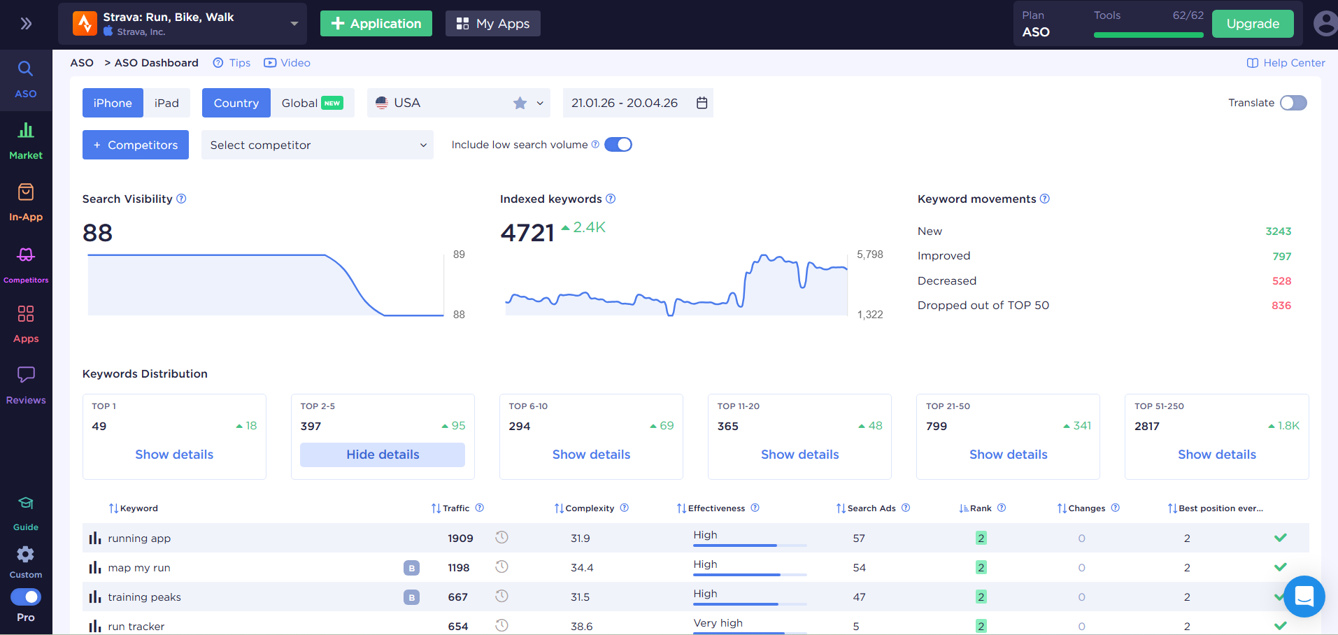 Keyword rankings — the baseline. Which positions your app holds for target queries, how they shift after metadata updates, and which keywords competitors are gaining on.