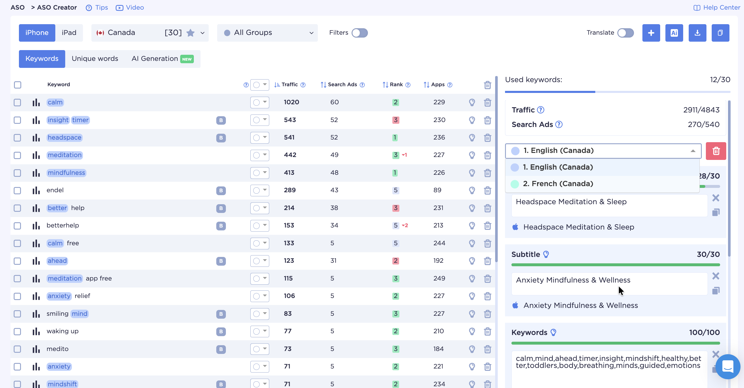 Щоб уникнути технічних помилок і спростити створення метаданих, ми використовуємо зручний інструмент ASO Creator. Тут уже доступний список додаткових локалей залежно від країни оптимізації та семантичне ядро, яке можна максимально ефективно використати.