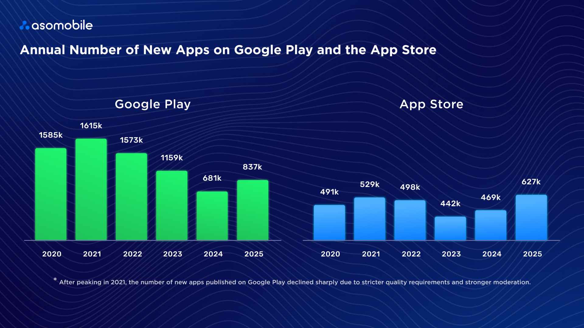 App Store демонстрував більш рівну динаміку. Після незначного спаду у 2023 році кількість нових релізів знову почала зростати — з 469 тисяч у 2024 році до приблизно 627 тисяч у 2025-му.